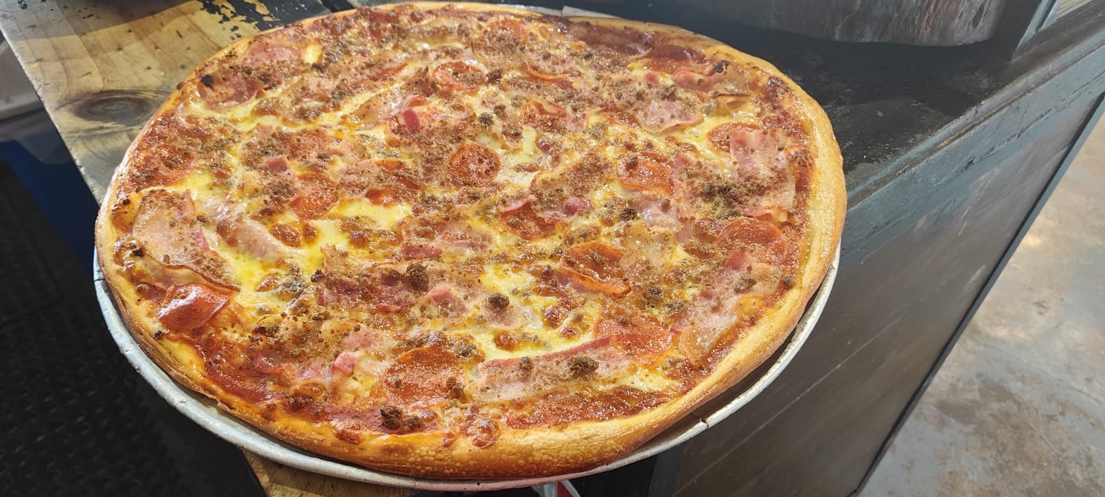 Una pizza para los verdaderos amantes de la carne: jamón, pepperoni, tocino, chorizo y carne molida, con abundante queso derretido sobre una base perfectamente horneada.