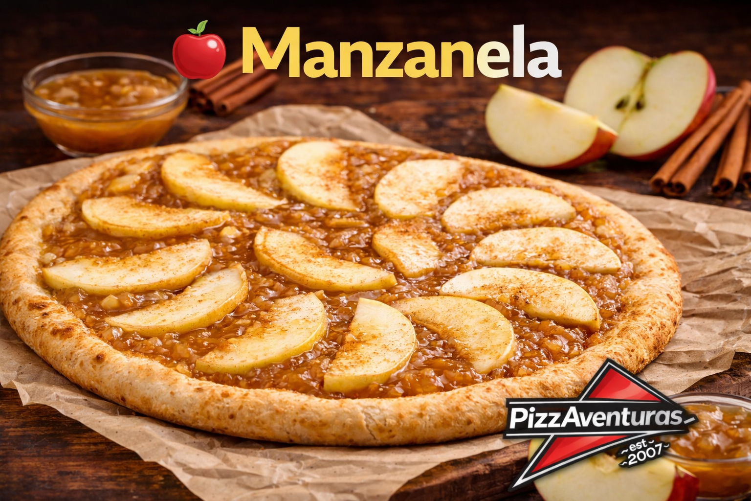 Pizza dulce irresistible con base crujiente, cubierta de mermelada de manzana, rebanadas frescas de manzana y un toque de canela. Dulce, aromática y perfecta para cerrar con algo diferente.