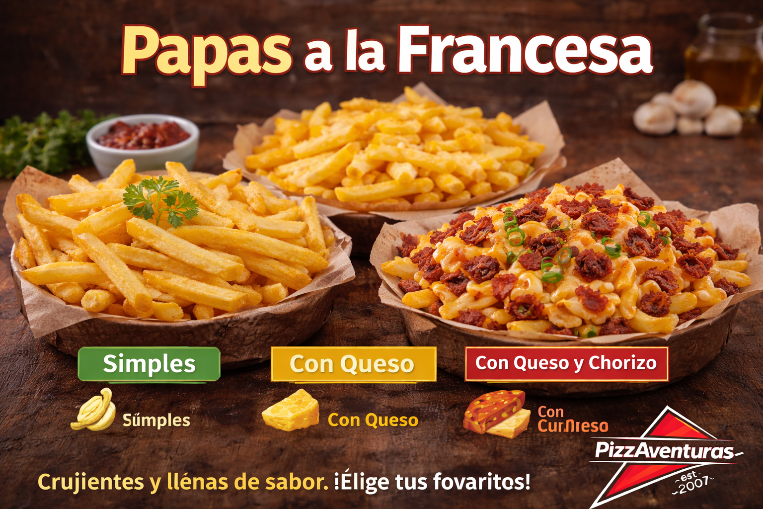 Elige entre Simples, con Queso o con Queso y Chorizo. 🍟🔥